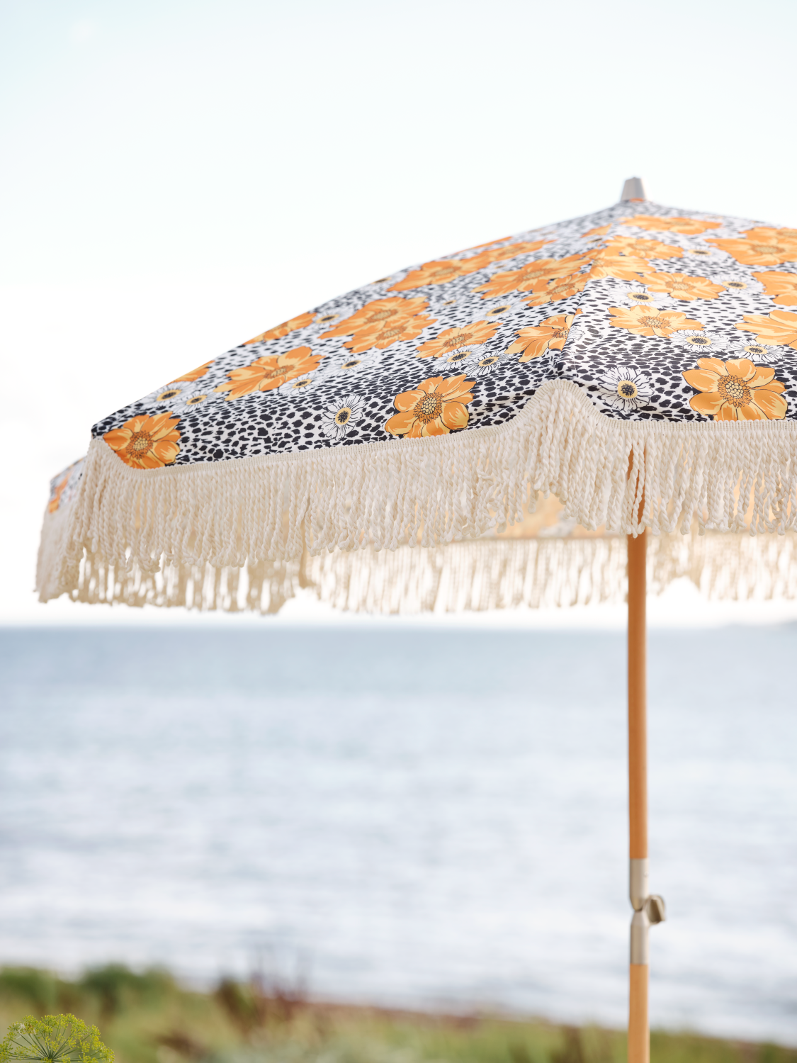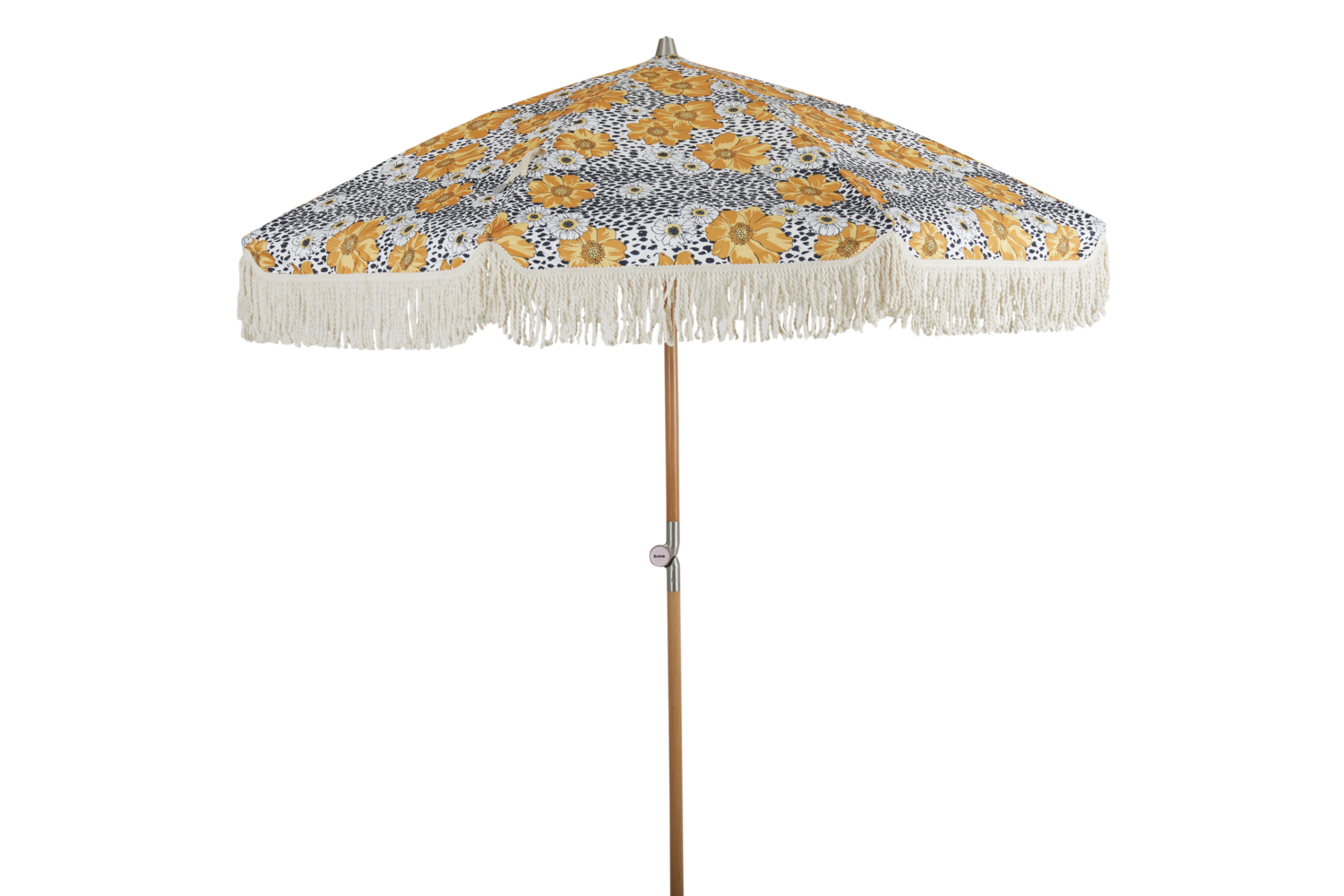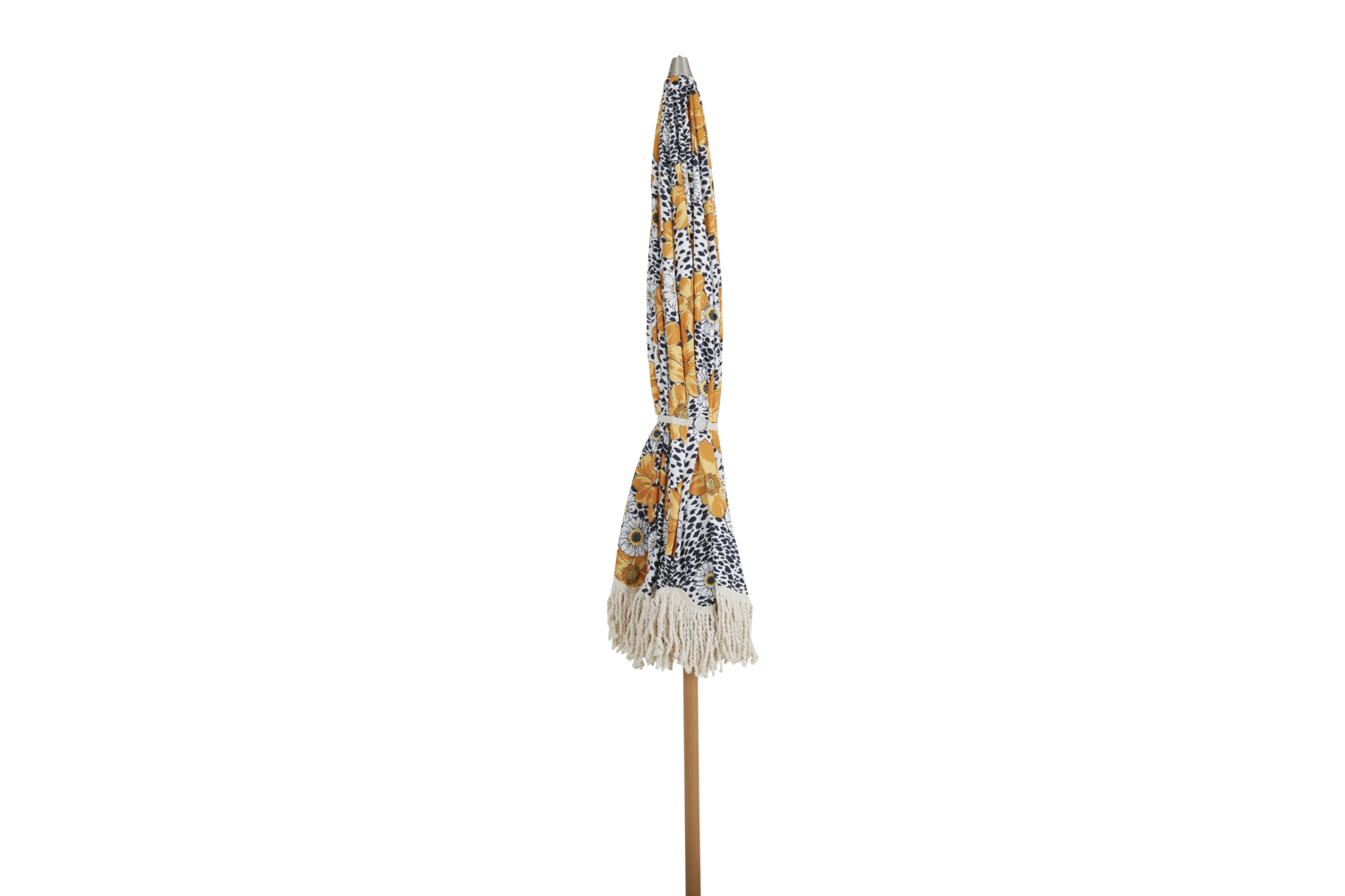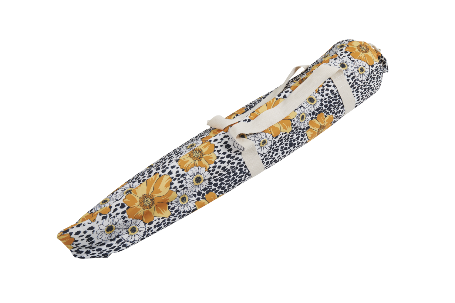 Gatsby parasoll är nätt (diameter på 180 centimeter) och har en smart lutningsfunktion. Det valda materialet är i toppklass för ändamålet: stången är i lackerad bok, pinnarna i stål och detaljerna i borstad zink. Gatsby kommer i en tillhörande väska i matchande tyg, vilket gör det enkelt att bära med sig. En skruv stångens botten gör att du enkelt kan skruva ner parasollet i sanden på stranden.